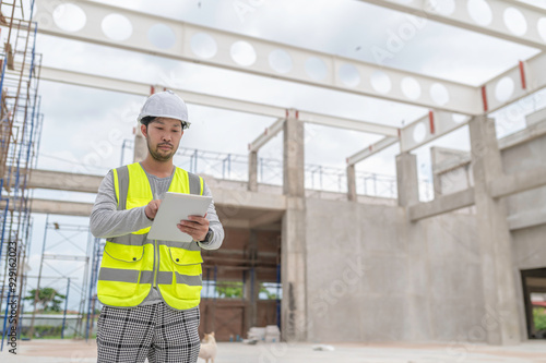 Two Asian engineer working at site of a large building project,Work overtime at construction site,Team of engineer discus at site,The architect, supervisor, and foreman meet to discuss the design