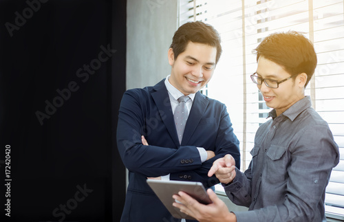 Two Asian handsome businessmen using touchpad with partners discussing documents and ideas at meeting and smiling happy for working