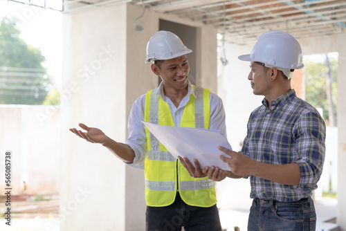 Two Asian male engineers are inspecting a job site and looking at drawings, consulting and debugging works to achieve quality work.