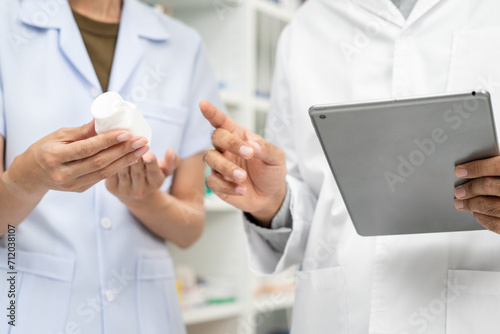 Two asian man and woman professional Pharmacist colleagues working at drugstore pharmacy. Asking the questions of medication standing near pharmacy shelves counter with medicines