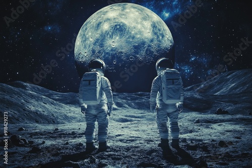 Two Astronauts Contemplating a Giant Moon in the Vastness of Space