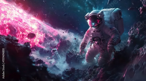 Two astronauts explore a vibrant, asteroid-filled nebula with a fiery, celestial event in the background.