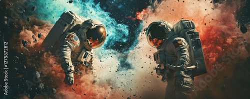 Two astronauts explore space surrounded by colorful smoke in a hyper-realistic and cinematic setting