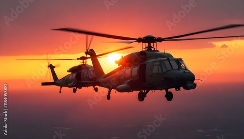 Two attack helicopters in formation soar against a vibrant sunset, exuding strength.