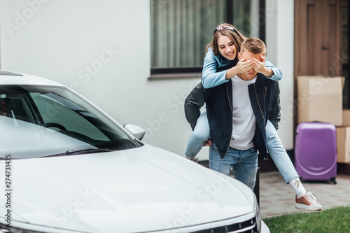 Two attractive married person buying new white car and they are happy. Woman playing with her man.