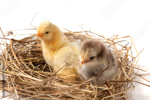 two baby chicken in the straw nest on white background