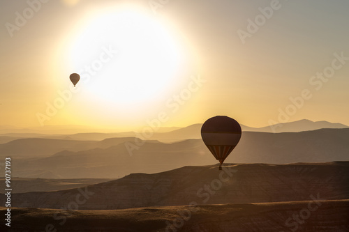 Two ballons in front of big sun over mointains and rocks in cappadocia