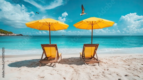 Two Beach Chairs Under Yellow Umbrellas on a Sandy Shore with Birds Flying Above a Clear Ocean