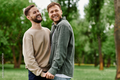 Two bearded men, an LGBTQ couple, laugh together in a green park on a sunny day.