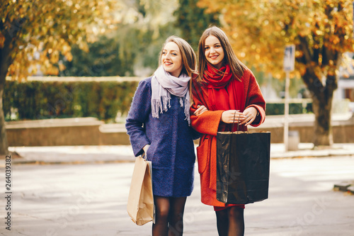 two beautiful and stylish girlfriends walking around the spring city with packages and shopping