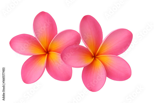two beautiful and vibrant pink and yellow frangipani flowers, isolated on a transparent background