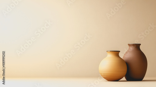 Two Beautiful Handmade Ceramics Vases on a Smooth Gradient Background Showcasing Unique Artistry and Craftsmanship in a Contemporary Setting