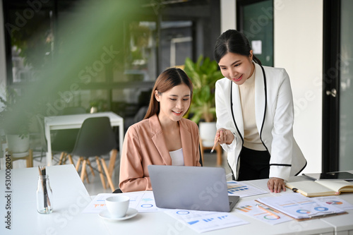 Two beautiful young Asian businesswomen working together in the office.