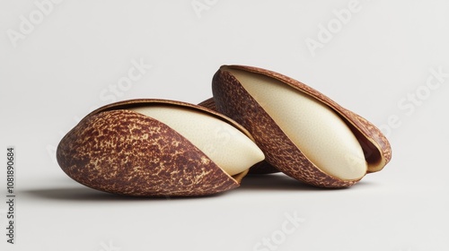 Two beautifully crafted brown and cream seamless pods resting on a light surface, showcasing their unique texture and design.