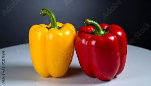 Two bell peppers, one yellow, one red, sit on a white surface against a dark background