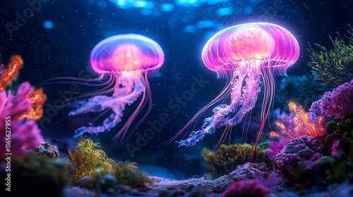 Two bioluminescent jellyfish gracefully swim amidst vibrant coral reef.