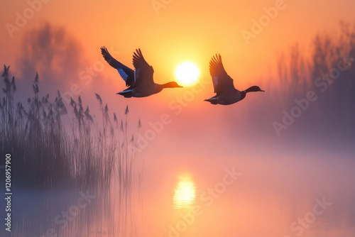 Two birds glide gracefully over a serene lake, silhouetted against the fiery hues of a stunning sunset.