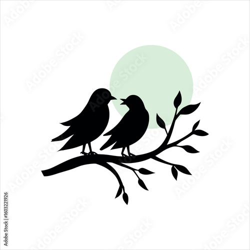 Two Birds Kissing on Tree Branch Beneath Moon Glow silhouette Art Vector illustration
