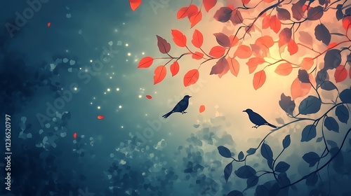 Two Birds Resting Among Autumn Leaves and Glowing Lights