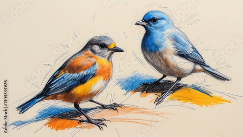 Two Birds Sketch. Blue and orange bird stands on simple ground in expressive crayon style. Art shows bird illustration on light surface.