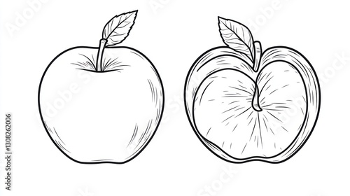 Two black and white line drawings of an apple and a half apple. Suitable for educational or food illustrations