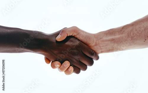 Two Black men shake hands against a white backdrop, signifying unity and collaboration
