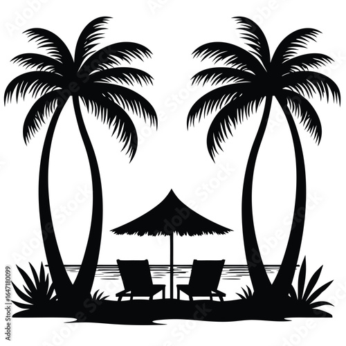 Two black palm trees lounge chairs and umbrella on beach
