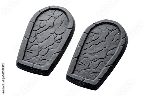Two black textured stone slabs or Gravestone isolated on a white transparent background. Concept of Halloween decoration.