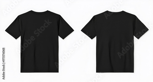 Two black t-shirts, one front view and one back view, isolated on a white background.