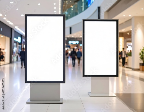 Two blank advertising billboards stand in a modern shopping mall with blurred shoppers