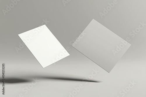 two blank business card mockups floating on a grey background with a soft shadow, two white round-cornered cards flying in the air for design presentation and branding mock-up template