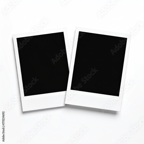 Two blank instant photo prints with white borders and black centers overlapping slightly on a crisp white surface, casting soft shadows