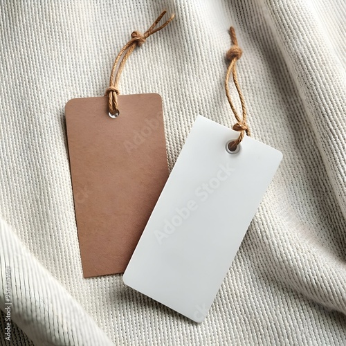 Two blank price tags with twine. one brown and one white. on a textured beige fabric background.