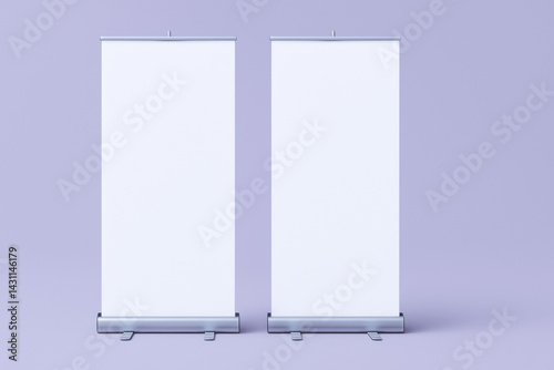 Two blank roll up banners stand side by side on neutral background, ready for customization