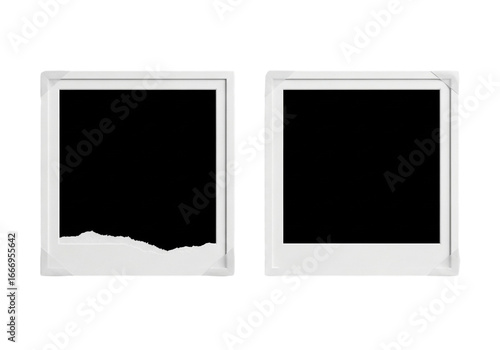 Two blank vintage photo frames, one torn, isolated on transparent background