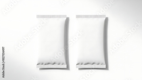 Two blank white sachet packets isolated on a clean background. A realistic 3D mockup template for food or condiment packaging design
