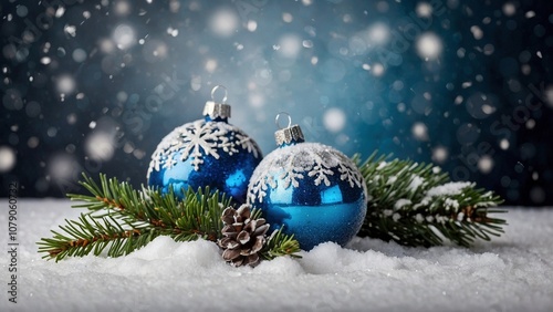 Two blue Christmas baubles and spruce branches in snow with blurred background and bokeh.
