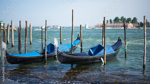 Two blue gondolas are moored on wooden pillars with lagoon on background