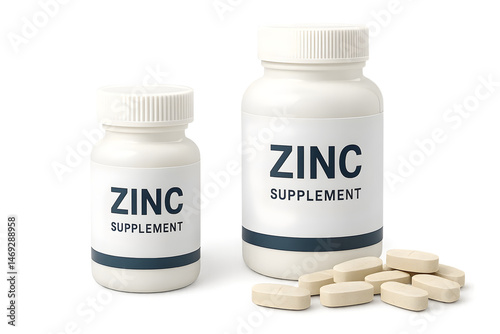 Two bottles of zinc supplements with labels, accompanied by several zinc tablets on a surface. Concept Zinc Supplements, Dietary Health, Nutritional Labels, Supplement Presentation, Tablets Display