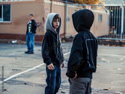 Two boys in hoodies standing in a gritty urban playground, with another boy in the background, creating a tense atmosphere.
