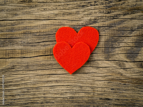 two bright red hearts on dark vintage texture old wood background, symbol of Valentine's day, copy space for text, top view.