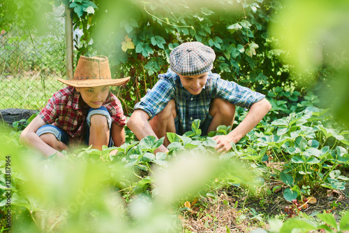 Two brothers harvest strawberries in the village