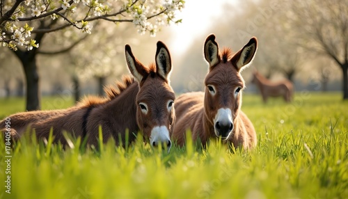 Two brown donkeys lie in green grass field surrounded by blossoming trees in spring. Animals relax in serene landscape with blooming flowers, rich vegetation. Donkeys enjoy peaceful atmosphere of