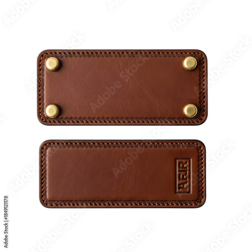 Two brown leather name tag holders with metal snaps, isolated on transparent background
