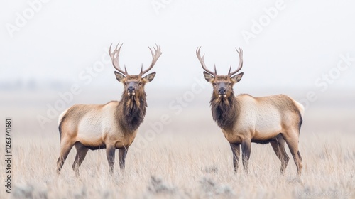 Two bull elk facing camera in foggy field