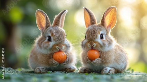 Two bunnies holding eggs, spring garden, sunlit background, Easter card