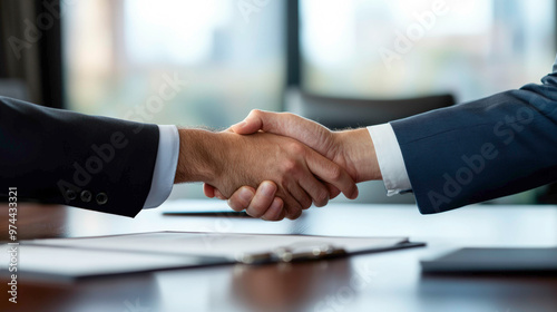 Two business executives shaking hands over a signed contract, symbolizing a successful partnership, formal agreement, and professional collaboration in a corporate setting.