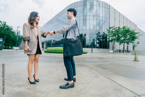 Two business man and woman shake hands outside a modern office building and successful business dealings. professionalism in a corporate setting. reflecting of collaboration and strategic planning.