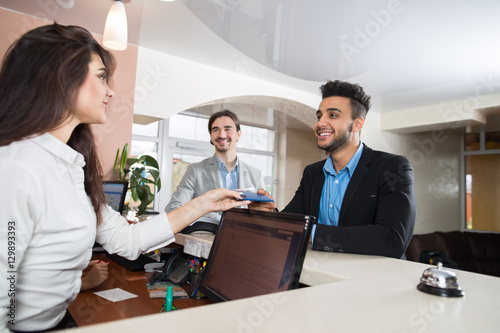 Two Business Man Arriving To Hotel Give Meeting Woman Receptionist Credit Card Pay Room Registration At Reception Counter Checking In