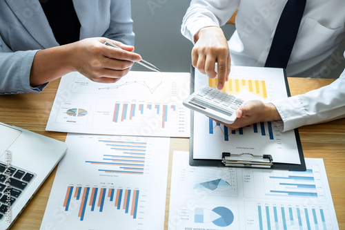 Two business partner team conference and discussion in investment ideas marketing planning and presentation finance project at meeting and strategy of business making to growth of profit
